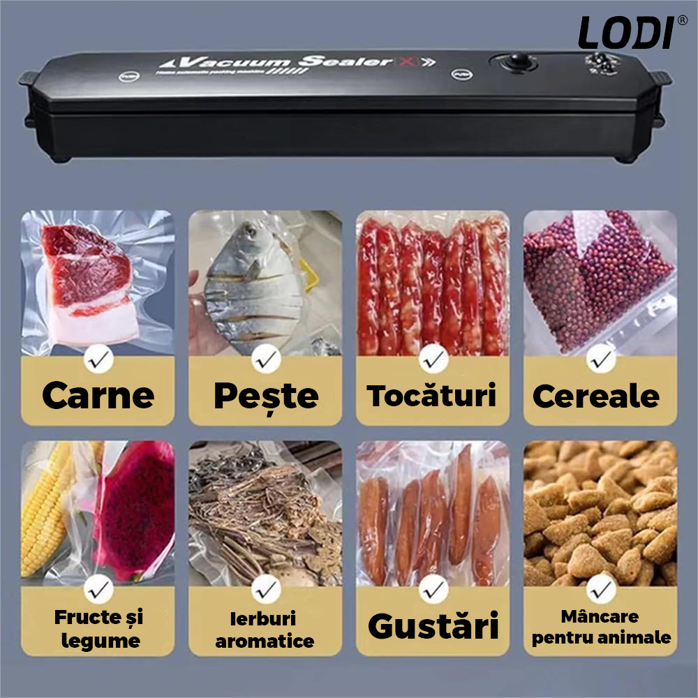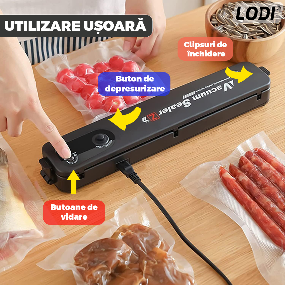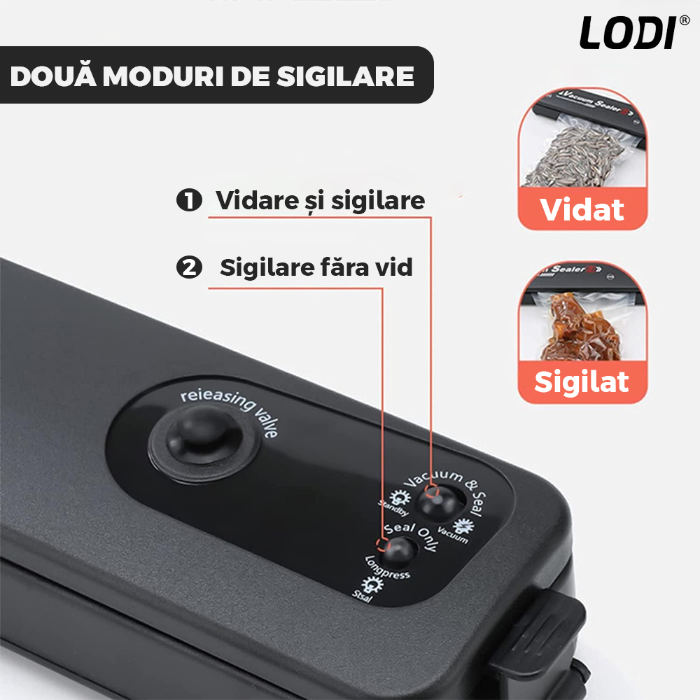 Aparat de Sigilat si Vidat Lodi1204, set 10 role de vidat gofrate 20 cm x 5 m incluse, alimente si obiecte, vidare umeda/uscata/soft, 90W, 220V, portabil, negru