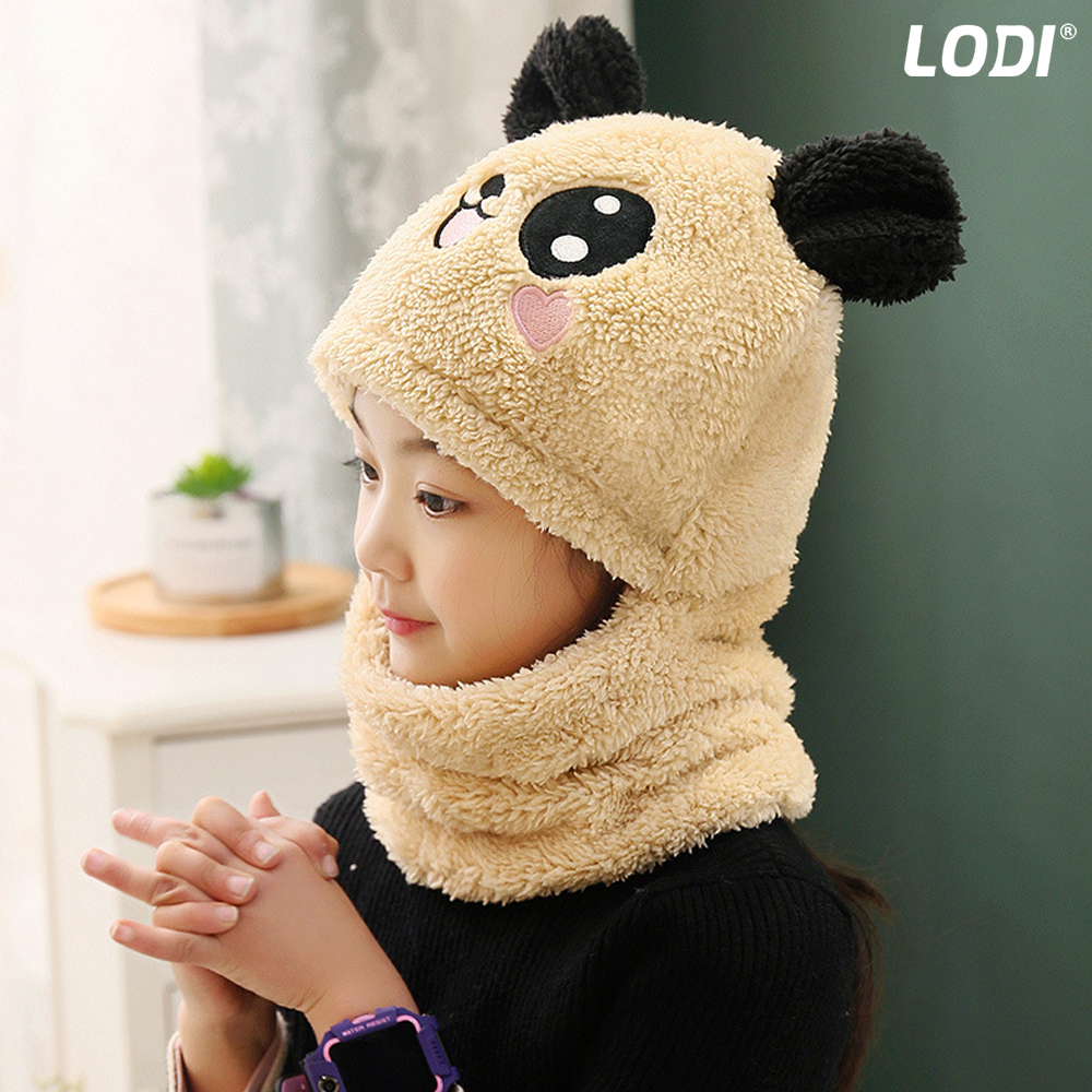 Caciula Pentru Copii Tip Cagula Lodi519, 2 in 1, tematica lumea animalelor, model ursulet panda zambitor, 1-5 ani, bej