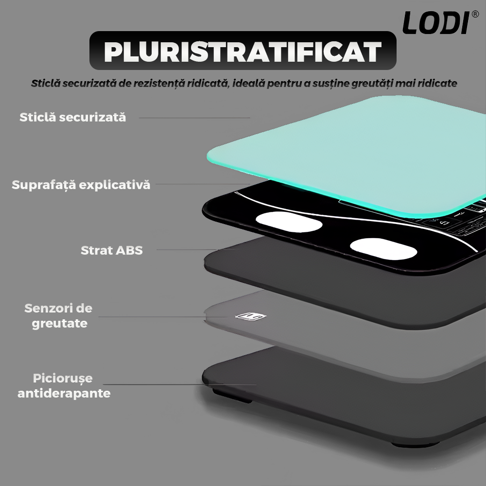 Cantar Electronic Inteligent Lodi1285, pentru baie, corporal, aplicatie smart, indicator greutate/baterie/temperatura, conectare bluetooth, afisaj digital iluminat, greutate maxima suportata 180 kg, baterii incluse, negru