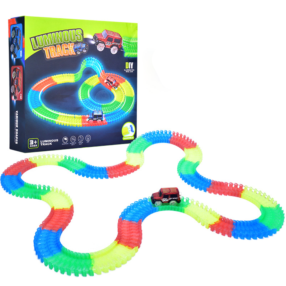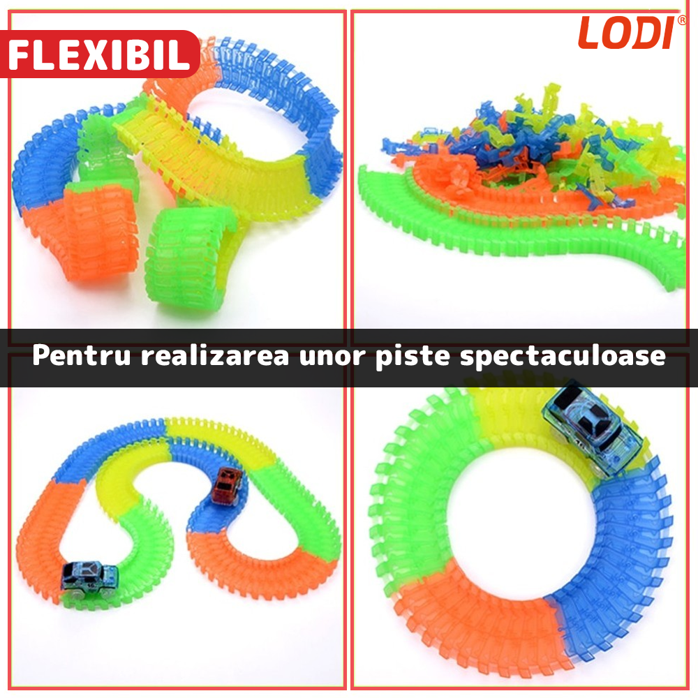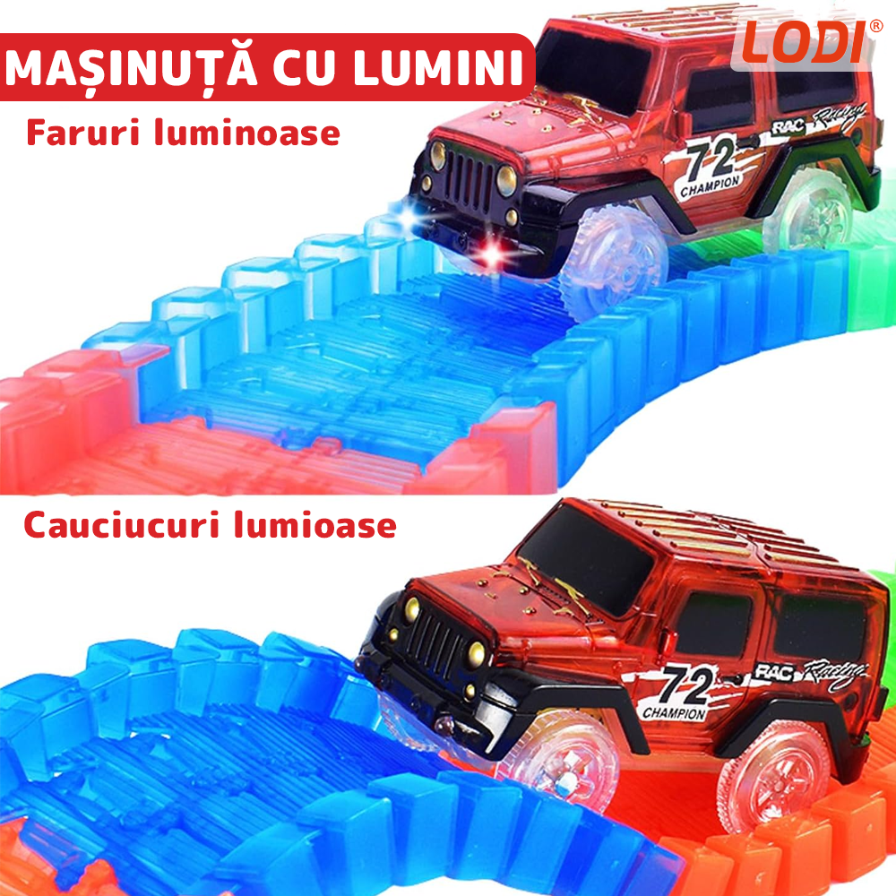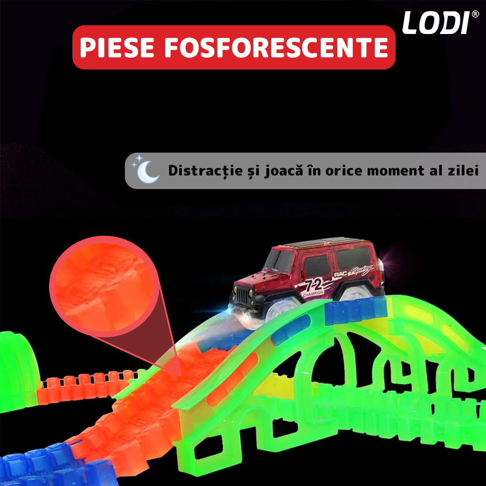 Circuit Masinute Lodi518, 241 piese, pista iluminata configurabila, fosforescenta, masinuta cu lumini rosie, multicolor