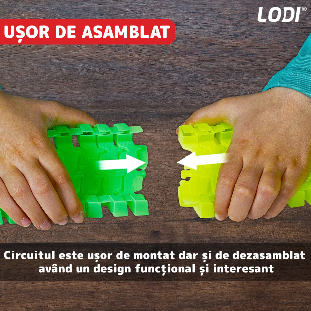 Configurabil si Usor de Asamblat: Pista este formata din piese flexibile si usor de conectat, permitand copiilor sa creeze trasee variate in doar cateva minute. Fiecare detaliu a fost gandit pentru a permite micilor constructori sa-si dezvolte creativitatea in constructia propriilor trasee.