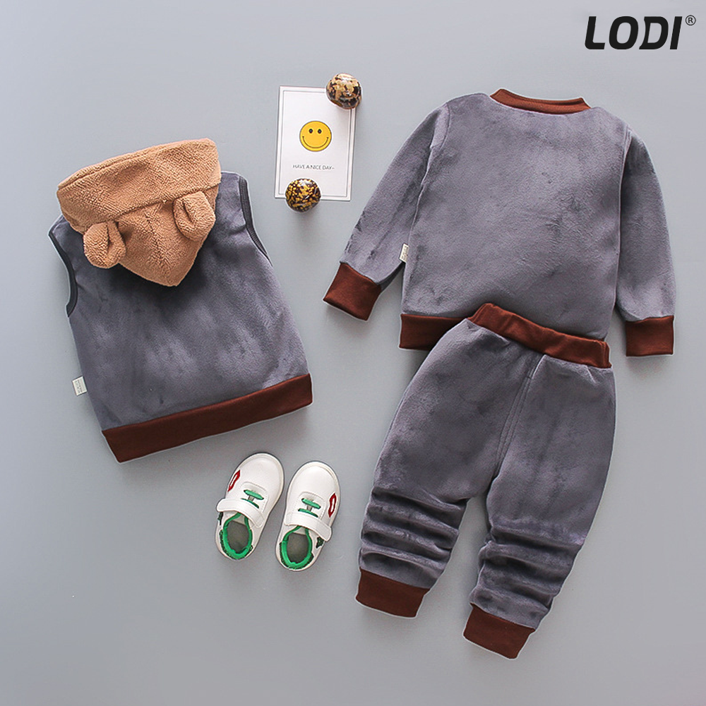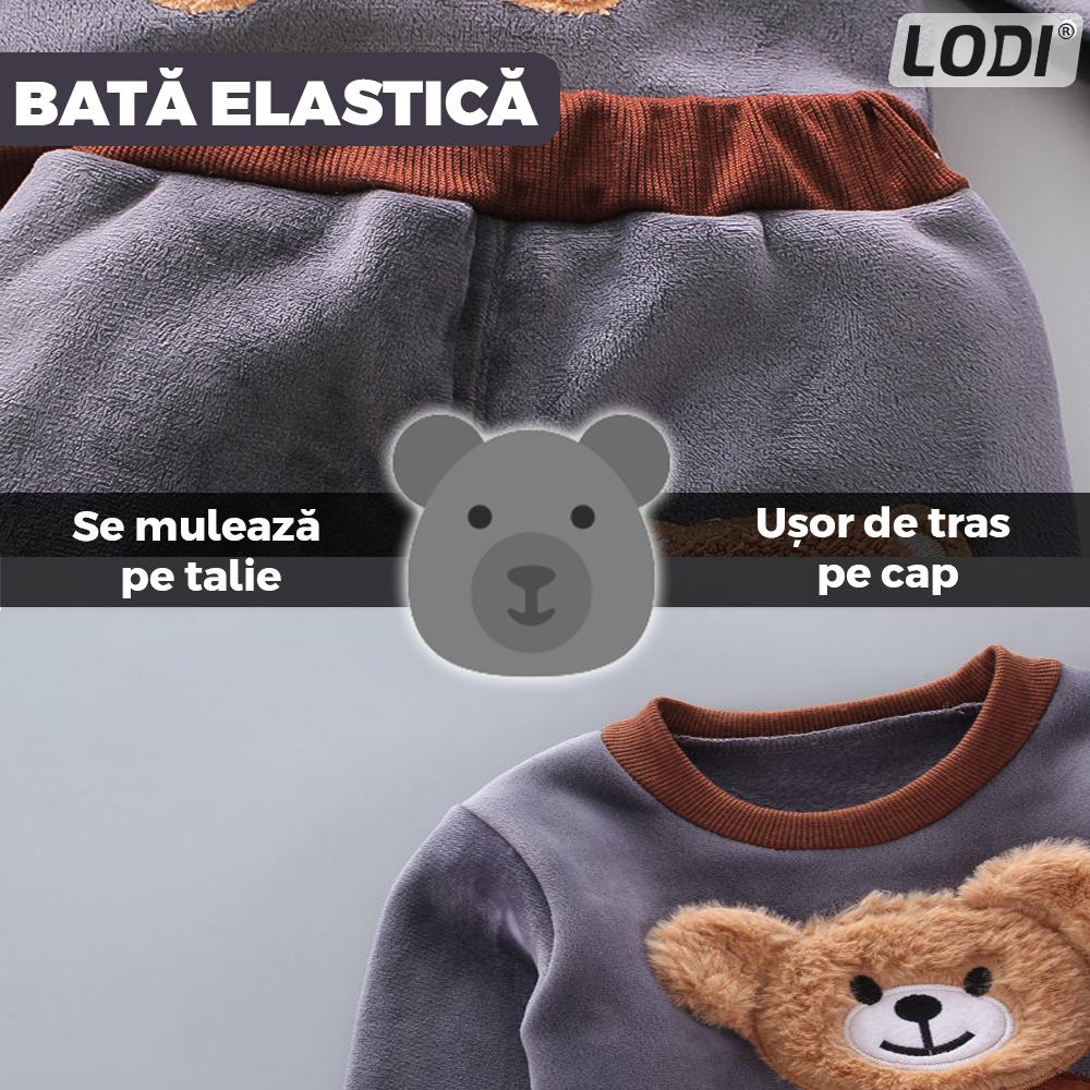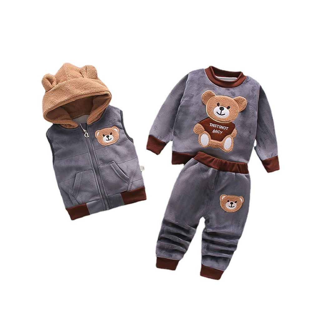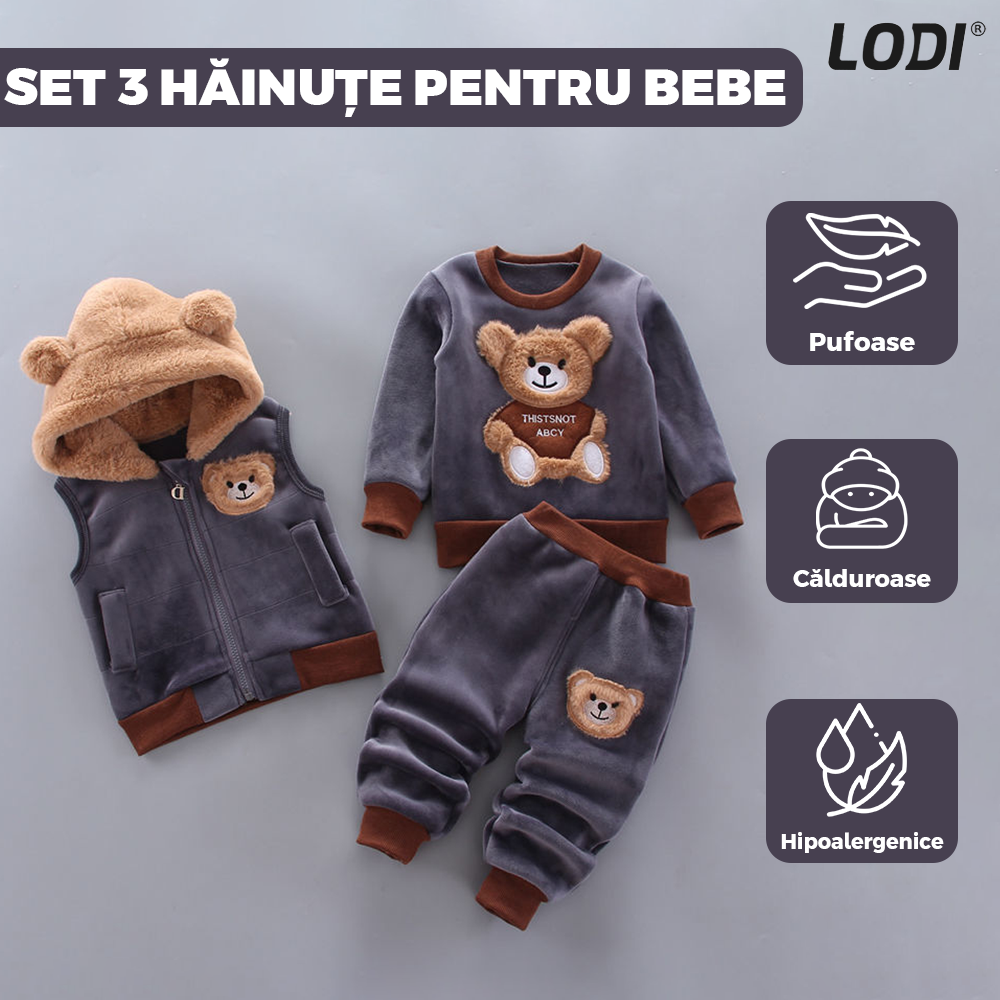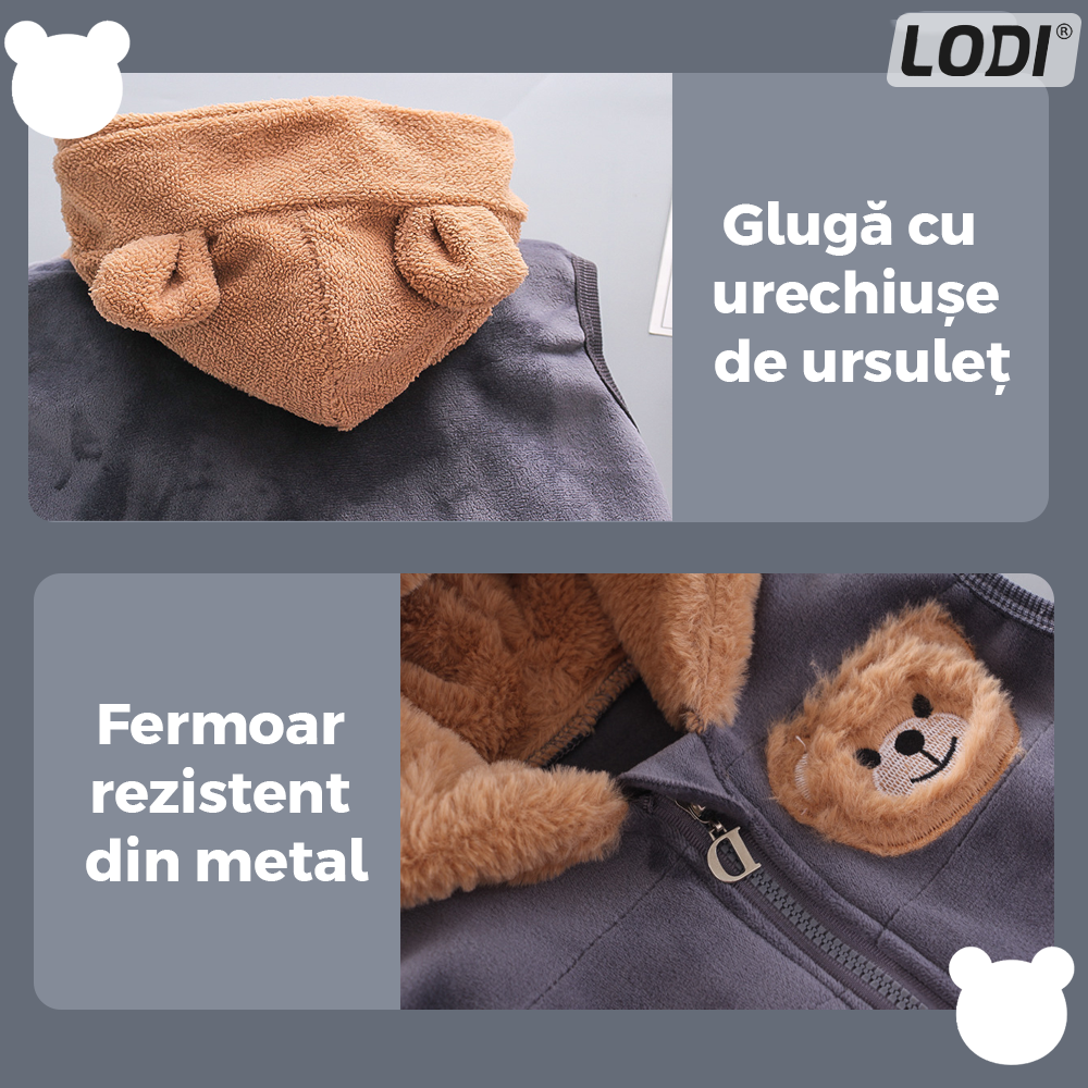 Compleu Copii din 3 Piese Lodi503, unisex, toamna-iarna, plus moale cu ursulet, bluza, pantaloni si vesta cu gluga pufoasa, 100 cm, gri