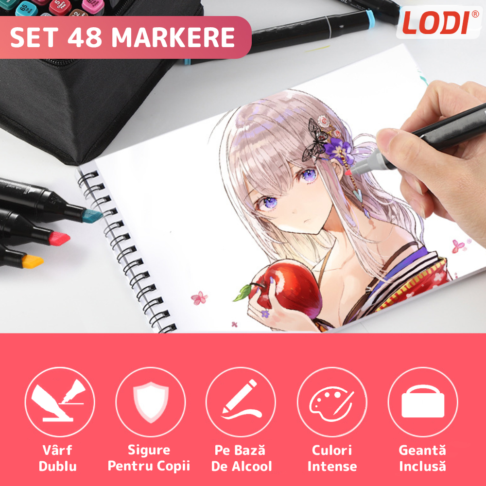 Setul de 48 de markere pe baza de alcool cu varf dublu reprezinta alegerea ideala pentru pasionatii de arta, designeri grafici, ilustratori sau pentru oricine doreste sa exploreze creativitatea cu ajutorul culorilor vibrante si calitatii superioare.