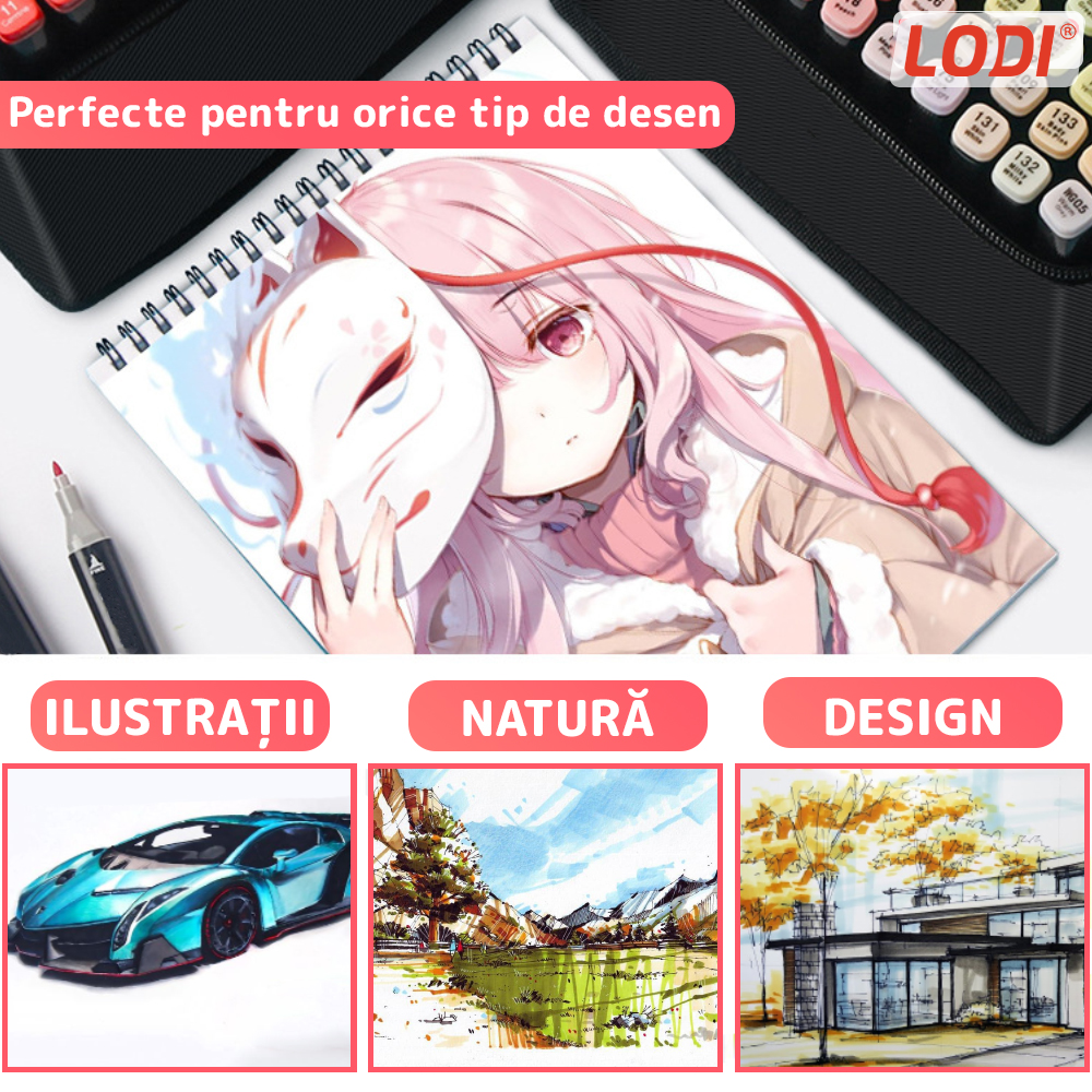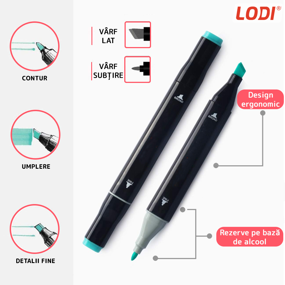 Fiecare marker contine cerneala pe baza de alcool, care ofera culori vibrante, intense si saturate, ideale pentru a crea ilustratii captivante si designuri impresionante. Pigmentatia de inalta calitate permite amestecarea usoara a culorilor, permitandu-va sa obtineti nuante si efecte unice.