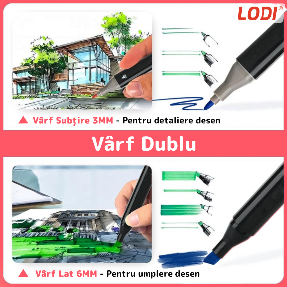 Acest set de markere inovator vine echipat cu varfuri duble, oferindu-va versatilitatea de a crea linii subtiri si detalii precise cu varful subtire, sau sa acoperiti suprafete mai mari si sa creati efecte de umbra cu varful lat. Astfel, puteti realiza o varietate de tehnici artistice si puteti adapta cu usurinta stilul dvs. de desen.