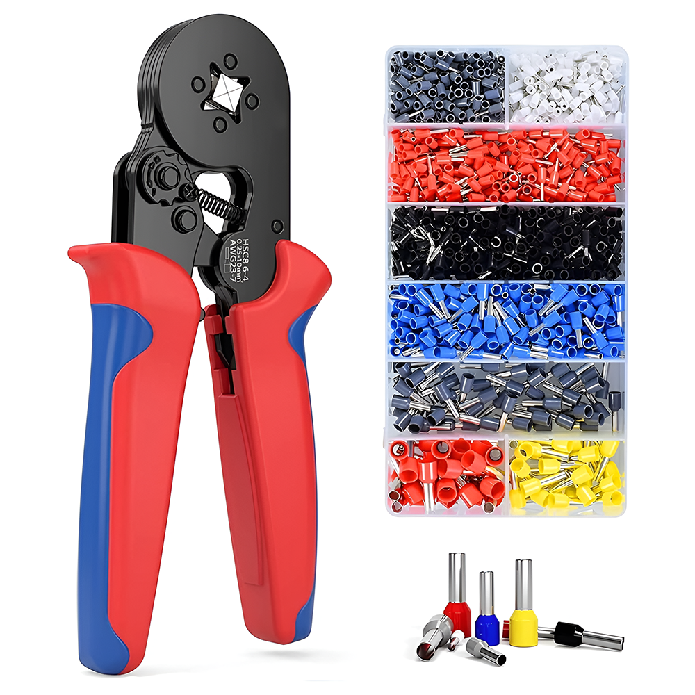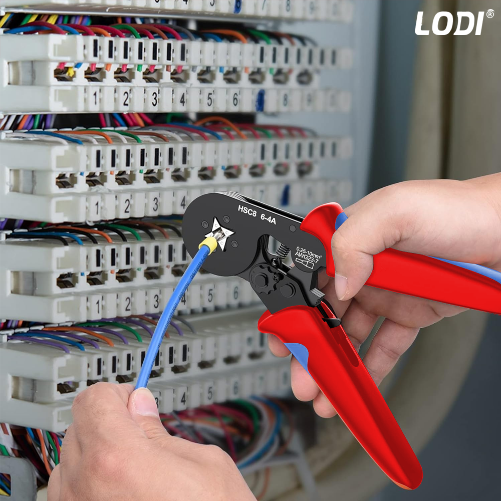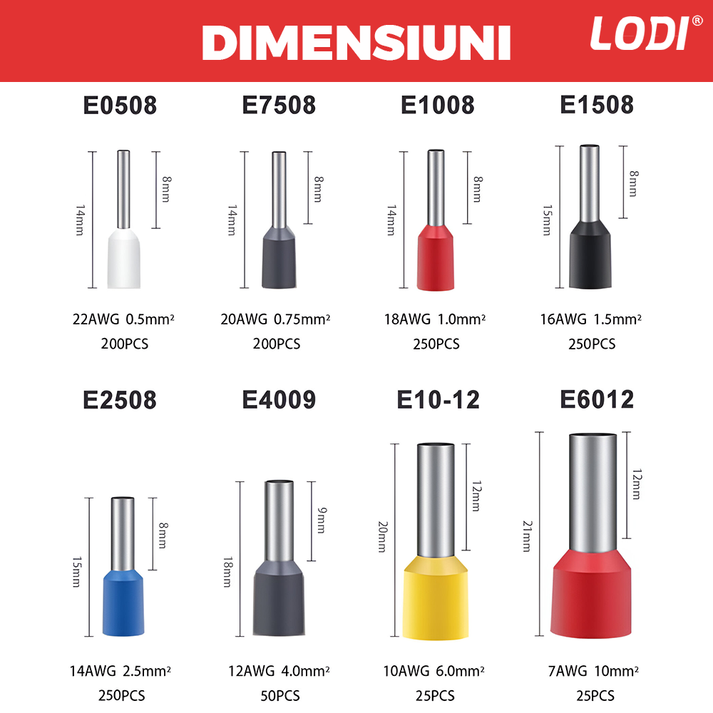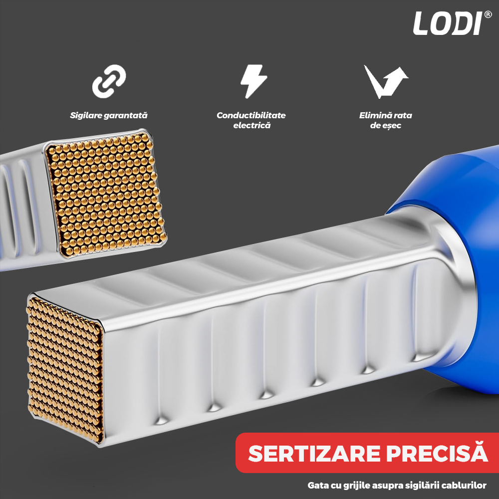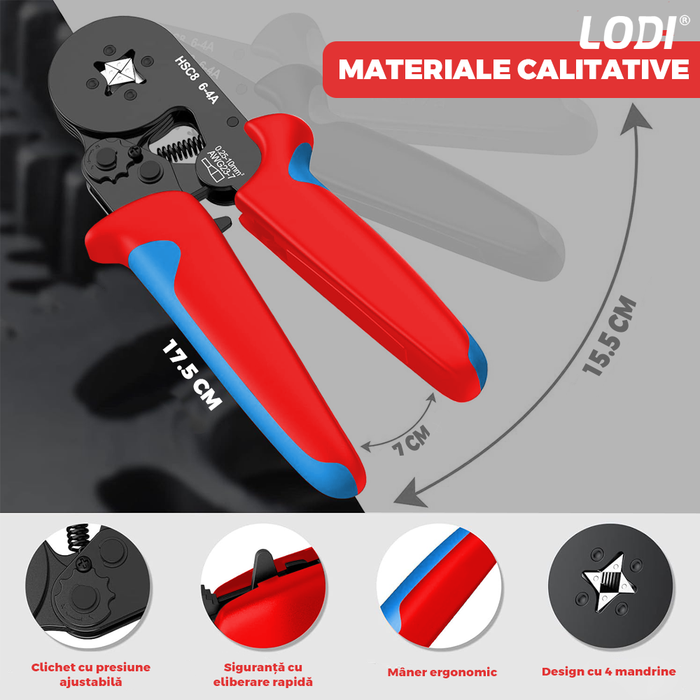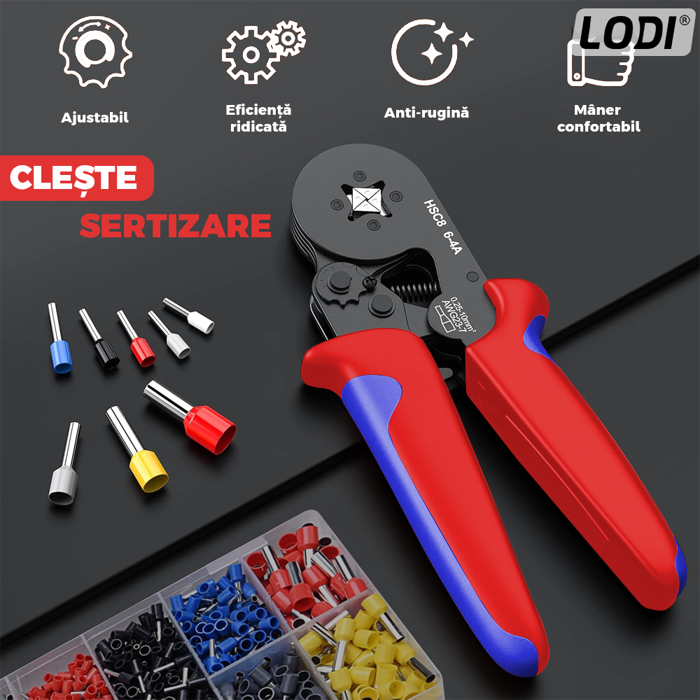 Trusa Sertizare Cabluri Electrice Lodi1267, ferule, cleste sertizare auto-reglabil cu revenire automata 0.25-10mm, maner anti-alunecare, 1200 pini terminali, rosu/albastru